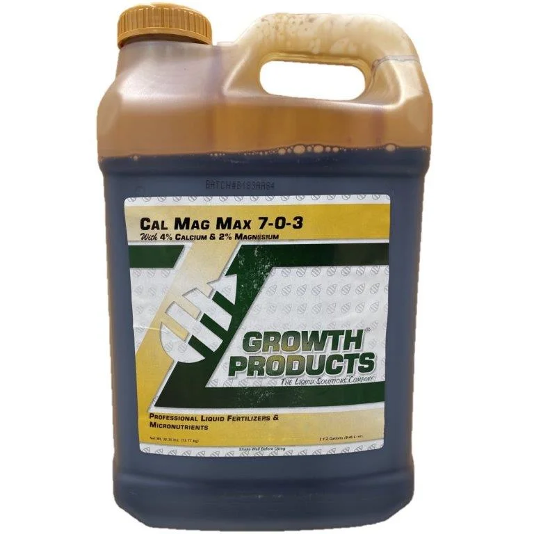 CAL MAG MAX 7-0-3 With 4% Calcium and 2% Chelated Magnesium Cal Mag Max is a Growth Products’ fertilizer with the power punch to serve plants with calcium, magnesium, and a kick of NPK. This product breaks the barriers between fertilizers and micronutrients, giving you the best of both. Cal Mag Max contains the perfect 2 to 1 ratio of calcium to magnesium. The calcium and magnesium are 100% chelated with a special sugar-acid chelate. Cal Mag Max works faster and is less wasteful because it is completely available as a foliar or soil drench. Use Cal Mag Max as a supplement, and in alternate feeding with a standard fertilizer. Green Industry professionals wage a constant battle to correct Calcium (Ca) and Magnesium (Mg) nutrient deficiencies that occur in plants. Symptoms of calcium and magnesium deficient plants include: Immature development and deformity of the plant. Calcium deficiencies most often occur in the newest growth of a plant. The leaves and new tissue of the plant will curl, twist, and eventually fall off. When a plant is deficient in magnesium, it is the older, more established leaves that are first affected. The plant will become chlorotic, with the leaves changing color beginning as a reddish brown and changing over to yellow. The end result is that the leaves curl and eventually drop off of the plant. To prevent and correct these deficiencies, a 2-to-1 calcium-to-magnesium ratio product is most often recommended. Growth Products’ Cal-Mag Max (7-0-3) fertilizer with 4% chelated calcium and 2% chelated magnesium fits the bill perfectly. It is quick-acting and easy to use. Cal-Mag Max is great for all classes of horticultural plants, including ornamentals, trees, shrubs, plants, turfgrass, etc.. When applied as a foliar spray, it provides almost immediate correction of calcium and magnesium deficiencies. It is the buyers responsibility to check the manufacturers label thoroughly to decide if the product is designed and safe for your application.